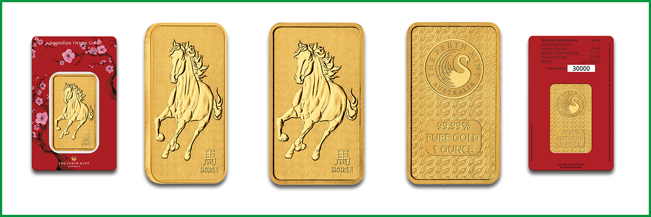 Weiterhin verausgabt die Perth Mint einen geprägten Goldbarren zu einer Unze, der auf seiner Rückseite mit einem Pferdemotiv von Lucas Bowers gestaltet ist. Eine versteckte Mikrolasergravur dient der Fälschungssicherheit. Die Vorderseite zeigt das klassische Logo der australischen Prägestätte auf einem strukturierten Hintergrund zusammen mit den Feindaten des Goldes.