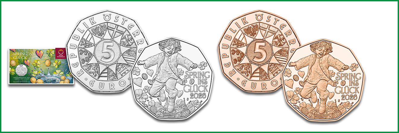 Mit der Neujahrsmünze »Spring ins Glück« gibt die Münze Österreich einen besonderen Glücksbringer in zwei Ausführungen heraus. Die neuneckige Münze ist wahlweise in 925er-Silber oder 999er-Kupfer verfügbar. Sie zeigt auf ihrem Avers ein lachendes Kind, das in eine Pfütze springt. Dabei verwandeln sich die aufsteigenden Wasserspritzer in Glückssymbole. Das Motiv von Mag. Helmut Andexlinger steht für den Mut und die Zuversicht, einen Neuanfang zu wagen. Die Vorderseite bildet die Staatszeichen der Republik Österreich ab und integriert im Zentrum den Nennwert über 5 Euro. Erhältlich ist die Sammlermünze wahlweise in den Ausführungen Normalprägung (Kupfer) und Handgehoben (Silber). Als Kupfermünze wird sie unverpackt ausgegeben, während die Silbermünze im bebilderten Blister angeboten wird.