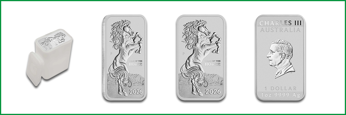 Die Serie der Lunar-Silbermünzbarren wird mit der Ausgabe 2026 im Jahr des Pferdes fortgesetzt. Dabei handelt es sich um einen Prägebarren der Perth Mint mit Nennwert, sodass dieser wie eine klassische Münze als Zahlungsmittel in Australien eingesetzt werden könnte. Die von Lucas Bowers gestaltete Rückseite zeigt ein anmutiges Pferd, dass sich auf seine Hinterbeine erhoben hat. Wehender Schweif und Mähne unterstreichen sein elegantes Erscheinungsbild. Ergänzt ist sind Münzname und Jahreszahl. Der Avers hat die Abbildung von King Charles III. nach Dan Thorne im Zentrum. Hier finden sich ebenfalls die Feindaten des Silber-Münzbarrens und der Nennwert über 1 Australische Dollar (AUD).