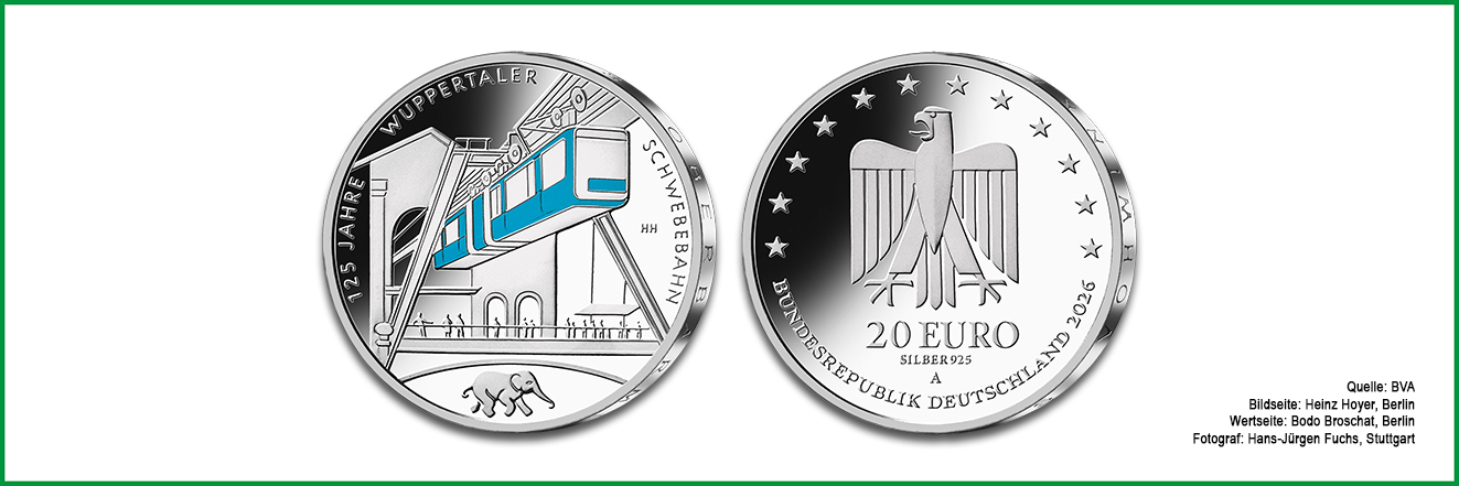 Die Entscheidung des BMF betrifft die Silbermünze zu 20 Euro mit der Bezeichnung »125 Jahre Wuppertaler Schwebebahn«. Die Gedenkmünze sollte ursprünglich am 22. Januar 2026 erscheinen und die Vorbestellung kurzfristig möglich sein. Ihr Motiv ist dem weltweit einzigartigen Fortbewegungsmittel und Wahrzeichen der Stadt Wuppertal in NRW gewidmet. Auf ihrer Bildseite stellt die Münze einen Gelenktriebwagen bei der Ausfahrt aus der Schwebebahnstation des Hauptbahnhofs dar. Durch den Einsatz der blauen Farbe wird das Schweben des Zugs noch hervorgehoben.