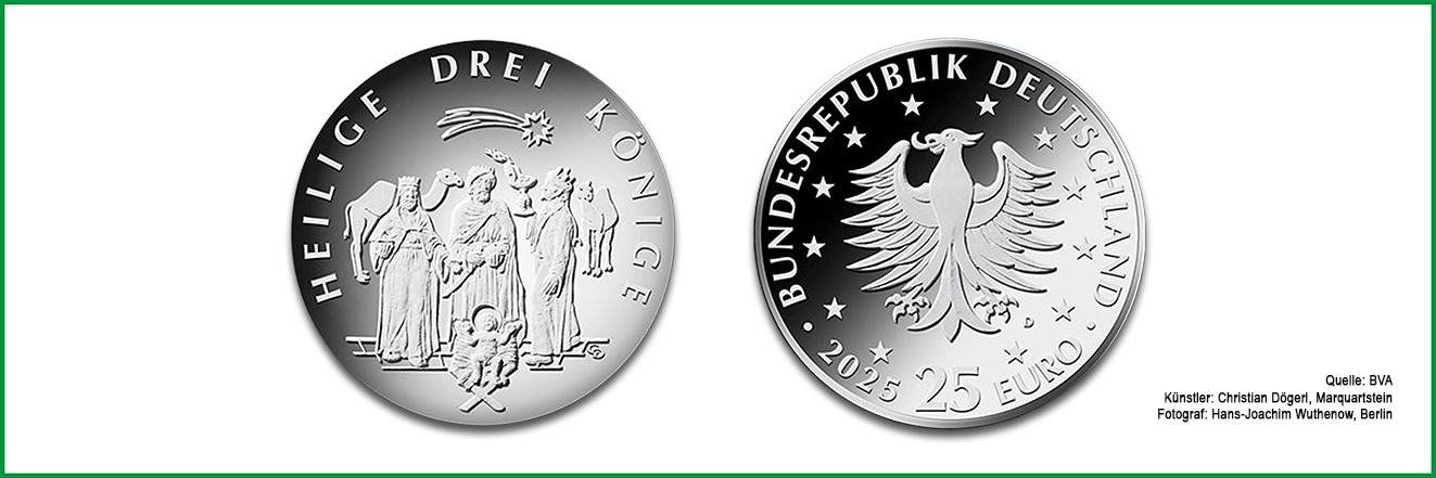 Mit dem Motiv »Weihnachten - Heilige Drei Könige« sollte die fünfteilige Serie der 25-Euro-Silbermünzen enden. Vorgesehen war der Erscheinungstermin 20. November 2025. Das Bildseiten-Design des Künstlers Christian Dögerl aus Marquartstein zeigt die Heiligen Drei Könige mit dem Christuskind in der Krippe. Im Hintergrund sind zwei Dromedare abgebildet, die nur flächenhaft erscheinen, was für eine hohe räumliche Tiefe der Darstellung sorgt, während die Szenerie im Vordergrund detailliert ausgearbeitet ist. Über der Szene schwebt der Stern von Bethlehem als lineare Komponente. Als Umschrift erscheint der Münzname. Die Wertseite zeigt den Bundesadler mit den Europasternen, Ausgabeland Bundesrepublik Deutschland, Erscheinungsjahr 2025 und Nennwert über 25 Euro.