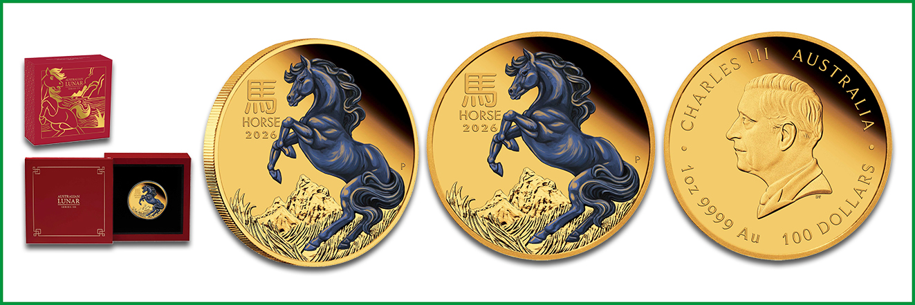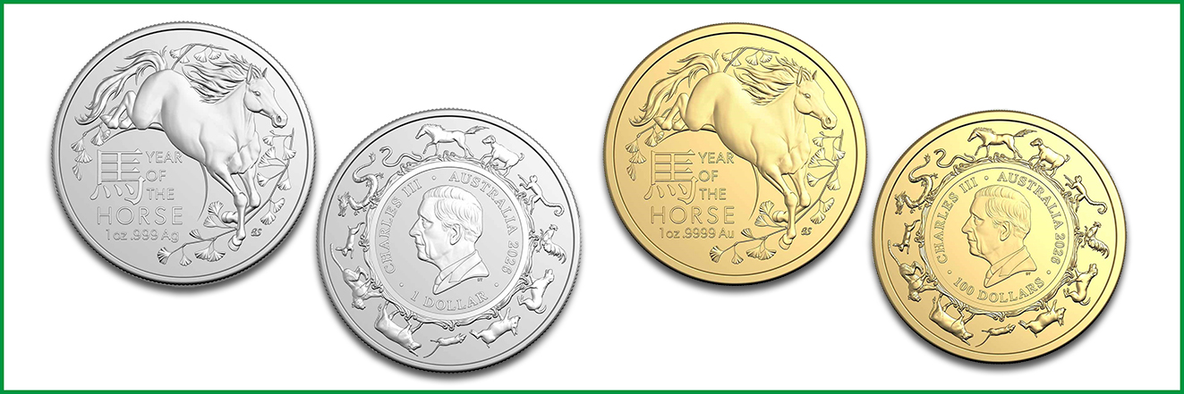 Für Anleger gibt die Royal Australian Mint ein neues Motiv aus der Serie Lunar heraus. Sie ist als Goldmünze Lunar RAM und als Silbermünze Lunar RAM zu jeweils einer Unze verfügbar. Das Rückseitenmotiv von Bronwyn Scott stellt ein springendes Pferd mit wehender Mähne und Schweif dar. Die Wertseite mit dem King Charles III-Motiv von Dan Thorne integriert alle zwölf Tierkreiszeichen im Außenring sowie den jeweiligen Nennwert in Australische Dollar.
