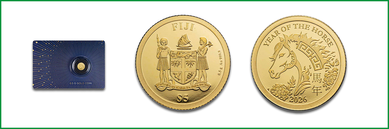 Für den Insel-Staat Fiji ist eine Goldmünze mit einem stilistischen Pferdekopfmotiv erschienen. Die Wertseite mit dem Nennwert über 5 Fiji-Dollar trägt das Wappen der Inselgruppe. Die Goldmünze zu 0,5 Gramm misst nur 11 Millimeter und entspricht 0,016 Unzen. Sie ist auf polierter Platte geprägt und wird auf einer eleganten Karte mit Acrylkapsel präsentiert. Die Gesamtauflage umfasst 5.000 Exemplare.