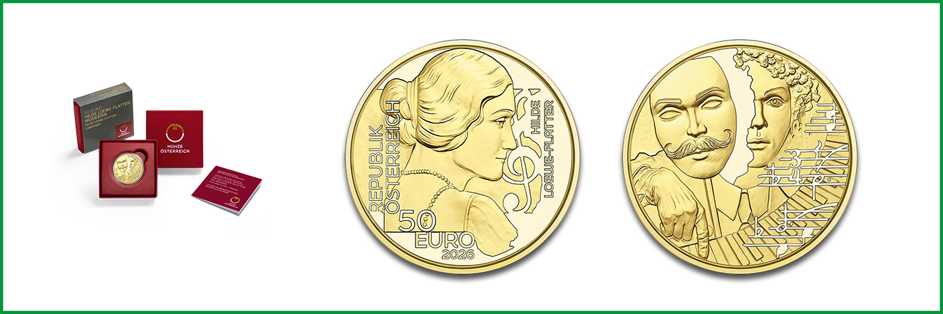 Seit 2023 erscheint einmal jährlich die 5-teilige Goldmünzen-Serie »Heimat großer Töchter«, die sich der österreichischen Kunst- und Kulturgeschichte anhand bedeutender Frauen widmet. Das von Helmut Andexlinger und Kathrin Kuntner entwickelte Design für 2026 präsentiert die Musikerin Hilde Loewe-Flatter, die unter dem Pseudonym “Henry Love” weltbekannte Melodien komponierte. Die Bildseite der Goldmünze zeigt das teilweise verdeckte Gesicht einer Pianistin und die Maske eines schnurrbärtigen Mannes, die für den Decknamen Henry Love steht. Eine Klaviatur und Noten beschließen die Gestaltung. Auf der Wertseite ist Hilde Loewe-Flatter gedankenversunken im Profil zu sehen. Ergänzt sind das Ausgabeland, Münzname, Notenschlüssel und der Nennwert über 50 Euro.