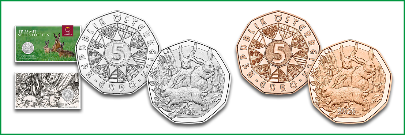Wie in jedem Jahr, so gibt die Münze Österreich auch 2026 wieder eine Ostermünze heraus. Diesmal ist das Motiv dem bekannten Holzschnitt “Heilige Familie mit den drei Hasen” von Alfred Dürer gewidmet, das der deutsche Maler und Grafiker vermutlich 1497 geschaffen hatte. Es zeigt drei Hasen im naiven Stil, umgeben von Gräsern und Blumen. Am rechten Bildrand ist das markante Monogramm von Albrecht Dürer integriert. Im Münzboden ist die Jahreszahl 2026 zu finden. Das neuneckige Münzdesign wurde von den Graveuren Helmut Andexlinger, Anna Schlindner und Rebecca Wilding aus dem Holzschnitt adaptiert. Die Wertseite zeigt die neun Landeswappen der Bundesrepublik Österreich, die im Kreis angeordnet sind. Das Zentrum bildet der Nennwert über 5 Euro.