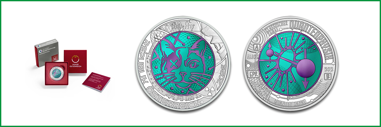 Das von Rebecca Wilding und Kathrin Kuntner entwickelte Design »Quantenphysik« zeigt auf der Bildseite Anton Zeilingers Experiment der Quantenverschränkung. Der vereinfachte Versuchsaufbau stellt die fiktionalen Messstationen “ALICE” und “BOB” dar, die über einen Quantenkanal sowie klassisch miteinander verbunden sind. Auf der Wertseite ist das Gedankenexperiment “Schrödingers Katze” mit Scalen und Symbolen abgebildet. Ergänzt ist das Motiv durch die Kurzform der Schrödinger-Gleichung sowie Ausgabeland, Prägejahr und Nennwert über 25 Euro.