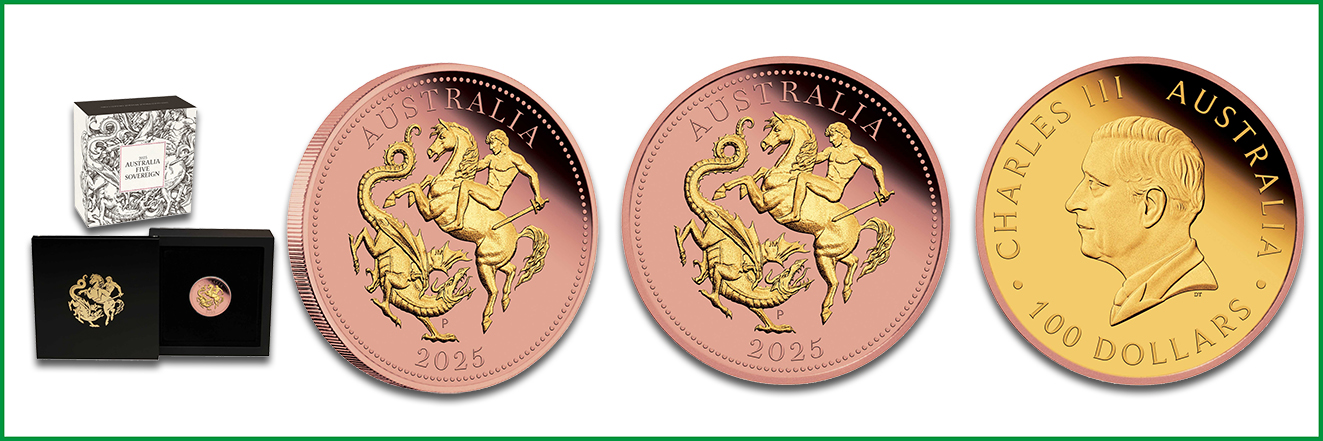 Die Goldmünze Sovereign zählt zu den bekanntesten Anlagemünzen weltweit. Neben der klassischen Bullionausgabe gibt die Perth Mint in diesem Jahr eine Sonderversion heraus, bei welcher der geriffelte Rand und der Hintergrund eine Veredelung aus 22-karätigem Roségold aufweisen. Auf dem zweifarbigen Revers ist das bekannte Szene des Ritters St. Georg zu Pferde im Kampf gegen den Drachen abgebildet. Die Vergoldung spart das Motiv aus, wodurch ein eleganter Effekt entsteht. Jennifer McKenna ist die Designerin. Die Vorderseite zeigt das Portraitrelief von King Charles III. nach Dan Thorn, zusammen mit dem Nennwert über 100 Australische Dollar (AUD).