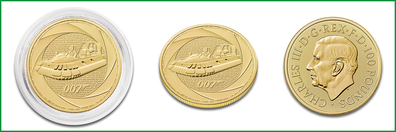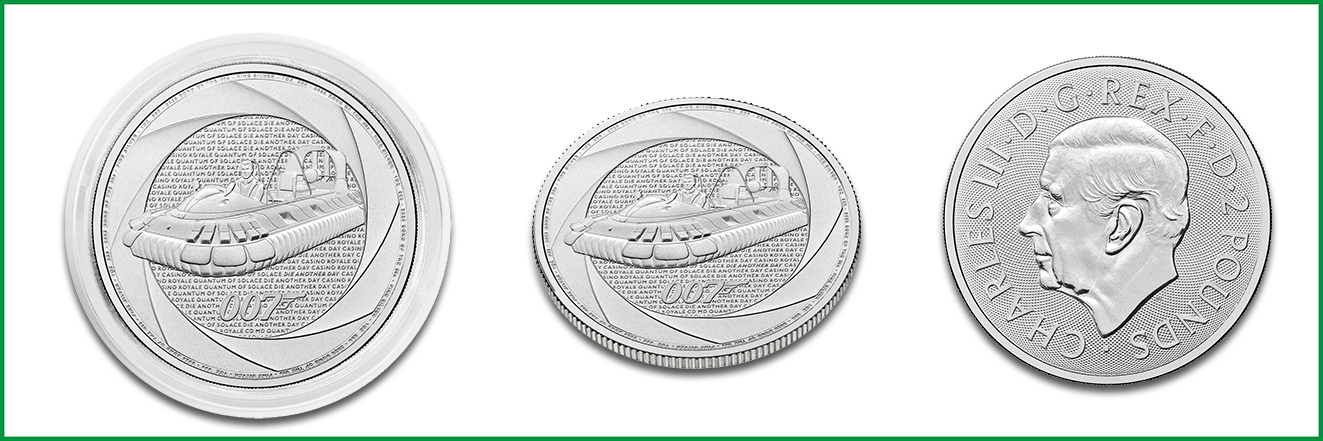 In den Edelmetallen Gold und Silber erscheint die neue Ausgabe aus der Serie »Bond of the 2000s« der Royal Mint. Der Revers zeigt die bekannte Eröffnungs-Sequenz aus dem James Bond-Film »Die Another Day« (Stirb an einem anderen Tag) von 2002 mit dem Hovercraft. Den Hintergrund bildet ein Schriftbild aus den Bond-Filmtiteln der 2000er-Jahre, das gleichzeitig der Fälschungssicherheit dient. Eingerahmt ist die Szene durch die charakteristische Gun-Barrel-Linse, die zu Beginn eines jeden 007-Films zu sehen ist. Das Motiv wurde von Matt Dent und Christian Davies entworfen. Die Vorderseite der Bullionmünze stellt das Konterfei von King Charles III. nach Martin Jennings mit dem Nennwert in Britische Pfund (GBP) dar.