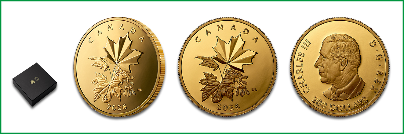 Ebenfalls spannend ist aus Sammlersicht die Goldmünze »Multifaceted Maple Leaves«. Sie präsentiert auf ihrer Rückseite eine Gruppe von Ahornblättern mit einem facettenreichen Blatt als Highlight. Das von Nathalie Lagancé entworfene Design wird durch das Ausgabeland Kanada und das Erscheinungsjahr 2026 ergänzt. Die Wertseite mit dem Nennwert über 200 Kanadische Dollar und dem Abbild King Charles III. wurde von Steven Rosati gestaltet.