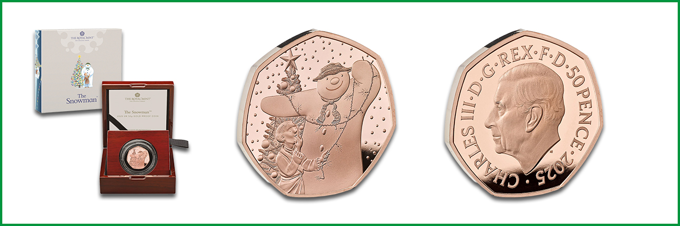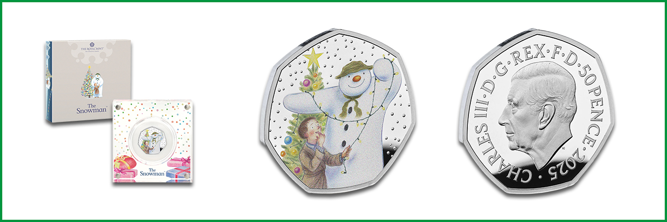 Ebenfalls von der Royal Mint erscheint die neue Ausgabe der beliebten Münzserie »The Snowman« nach den bekannten Märchenbüchern von Raymond Briggs. Das von Robin Shaw interpretierte Rückseitenmotiv zeigt den Schneemann zusammen mit seinem Schöpfer, dem kleinen James beim Schmücken des Weihnachtsbaums. Die Wertseite mit dem Bildnis von König Charles III. wurde von Martin Jennings gestaltet. Sie integriert das Prägejahr und den Nennwert über 0,50 Britische Pfund (GBP).