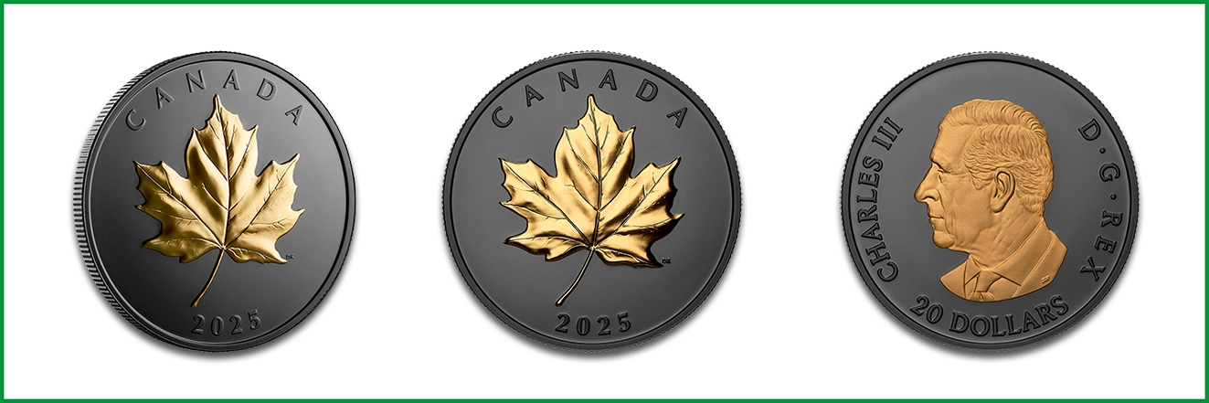 Eine Besonderheit stellt ebenfalls die vergoldete Silbermünze »Elegant Maple« dar, die von der Royal Canadian Mint ausgegeben wird. Sie stellt auf ihrer Rückseite ein einzelnes Zucker-Ahornblatt dar, das durch eine selektive Vergoldung hervorgehoben wird. Das Design stammt von Donna Kriekle und integriert das Ausgabeland Kanada und das Prägejahr. Dazu erhielt die Feinsilbermünze einen schwarz rhodinierten Hintergrund, der sich ebenfalls auf dem Avers findet. Die Teilvergoldung highlightet das von Steven Rosati entworfene Portrait von König Charles III. Dezent ergibt sich die Umschrift mit dem Nennwert über 20 Kanadische Dollar (CAD).
