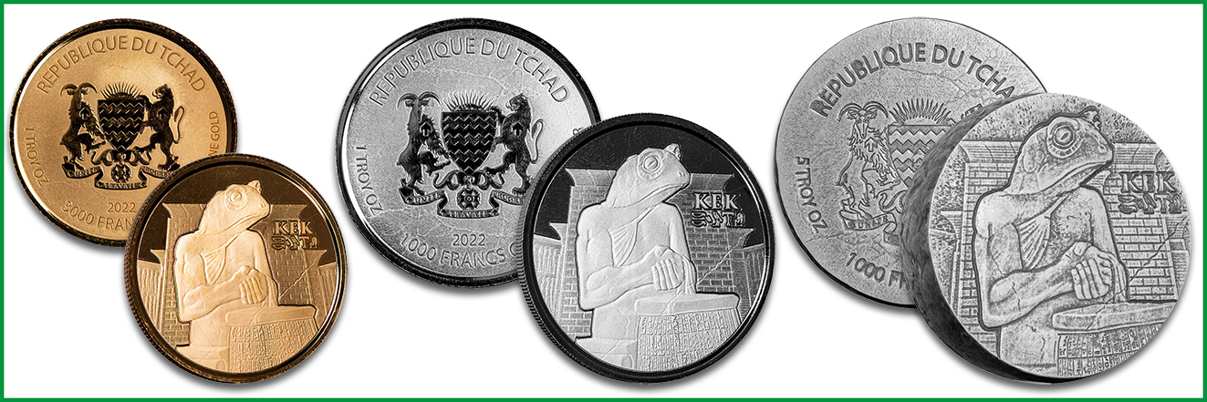 Die Scottsdale Mint produziert ebenfalls die neue Münze für die zentralafrikanische Republik Tschad aus der Egyptian Relic Series (ERS). Sie wird unter dem Jahrgang 2022 geführt und trägt die Bezeichnung »Kek«. Die Reliktmünze hat den ägyptischen Gott Kek zum Motiv. In der Mythologie stellt er die Verkörperung der abgrundtiefen Leere dar, aus der alle Dinge hervorgegangen sind. Dabei symbolisiert der Frosch seine Verbindung zum Nil und zur Fruchtbarkeit, die Schlange steht für seine Verkettung zur Unterwelt sowie zu den Mächten des Bösen. Bis auf den zweisprachigen Münznamen ist der Revers dem Motiv vorbehalten.