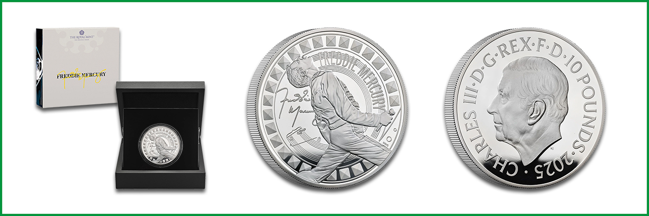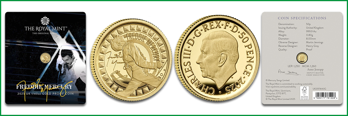 Während 2020 bereits die Rockband Queen mit einer eigenen Münze geehrt wurde, veröffentlicht die britische Royal Mint nun erstmals ein Design, das ausschließlich dem charismatischen Frontmann der Gruppe gewidmet ist. Aus der Serie »Music Legends« erscheint das Motiv Freddie Mercury. Der 1991 verstorbene Musiker ist in einer charakteristischen Bühnenpose dargestellt, mit der ikonischen Mikrofonstange in den Händen. Ein integriertes Notenband steht für die unzähligen Kompositionen des Genies. Integriert sind zudem seine Signatur und sein Name in Versalien. Ein Nietenband bildet den Rahmen. Entwickelt wurde das Design von Henry Gray in Kooperation mit Mercury Songs Ltd. Die Wertseite mit dem Nennwert und dem Portrait von König Charles III. wurde von Martin Jennings gestaltet.