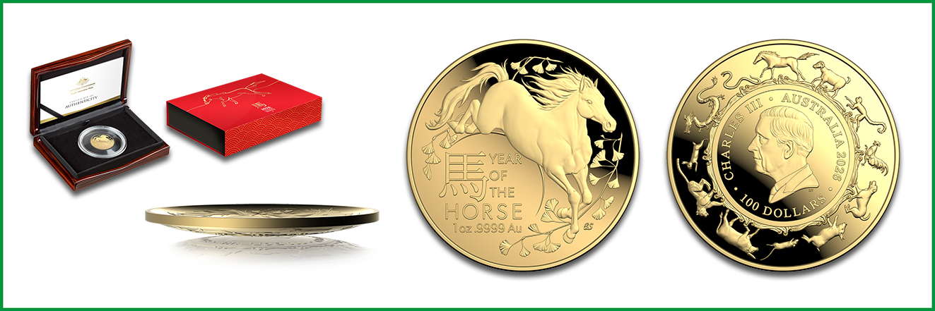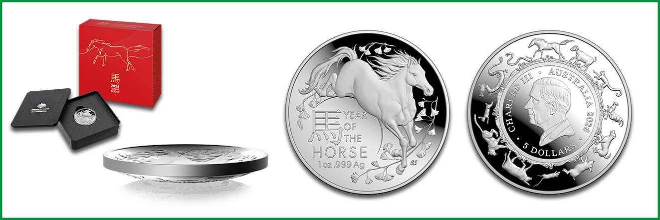 Das Jahr 2026 ist dem Tierkreiszeichen Pferd gewidmet. Neben den klassischen Ausgaben in Stempelglanz und Polierte Platte bringt die Royal Australian Mint auch eine gewölbte Version aus ihrem Lunar-Programm heraus. Dabei wird das Motiv mit dem springenden Pferd vertieft dargestellt, wodurch ein dreidimensionaler Effekt entsteht. Ergänzt wird das Design von Bronwyn Scott (BS) durch den Münznamen »Year of the Horse« in englischen und chinesischen Schriftzeichen sowie durch die Feindaten der Münze. Die Wertseite mit King Charles III. im Zentrum und den zwölf Tierkreiszeichen des chinesischen Mondkalenders erscheint nach außen gewölbt. Hier befinden sich ebenfalls Erscheinungsjahr und Nennwert in Australische Dollar.