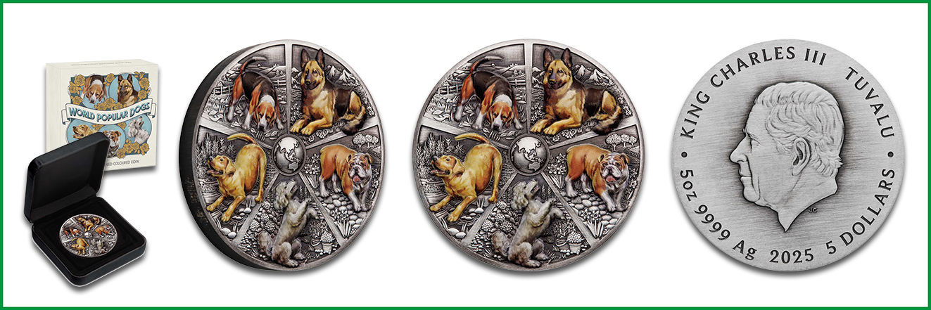 Die australische Prägestätte Perth Mint gibt eine besondere Sammlermünze im Antik-Finish heraus. Die Silberfarbmünze stellt auf ihrer Bildseite eine Auswahl der beliebtesten Hunderassen der Welt vor. Auf je einem Fünftel der Münzfläche sind die Rassen Deutscher Schäferhund, Bulldogge, Pudel, Labrador Retriever und Beagle dargestellt. Jedes Tier ist vor einem stilisierten Hintergrund abgebildet, welcher die natürliche Umgebung seines Ursprungs zeigt. Im Zentrum befindet sich eine Weltkugel als Symbol für die globale Schätzung dieser Arten. Das Design stammt von der Künstlerin Jenifer McKenna. Die Wertseite ist King Charles III. nach Jody Clark gewidmet. Sie integriert den Nennwert über 5 Tuvalu Dollar (TVD) für den Inselstaat als Ausgabeland. Als Besonderheit ist jede Münze von Hand “antikisiert”, sodass es sich um Unikate handelt.