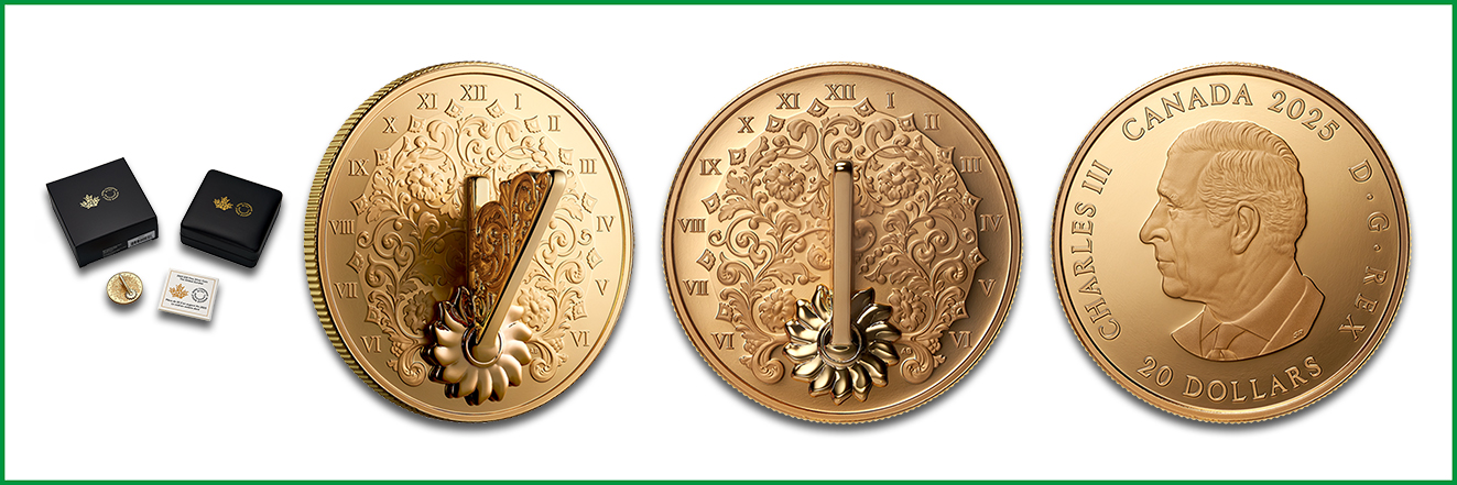 Im extravaganten Design präsentiert sich die vergoldete Silbermünze »Sundial« der Royal Canadian Mint. Sie ist in Form einer funktionalen Sonnenuhr gestaltet, wie sie auch heutzutage noch vielfach in den Gärten als Dekorationselement zu finden ist. Die Münze ist auf ihrer Rückseite mit einem vergoldeten Messing-Gnomon verziert, der bei korrekter Ausrichtung einen schrägen Schatten wirft und so die lokale Sonnenzeit anzeigt. Die Münze selbst ist kunstvoll mit Akanthusblättern graviert und integriert die Stunden des Tages in lateinischen Ziffern. Gestaltet wurde das Motiv von Anna Bucciarelli. Die Vorderseite stellt King Charles III. im Design von Steven Rosati dar.