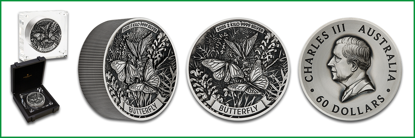 Ebenfalls von der Perth Mint ist die Silbermünze Butterfly 2025 erschienen. Es handelt sich um eine Münze zu 2 Kilogramm im eleganten Antik-Finish. Sie ist als nach innen gewölbtes Hochrelief geprägt, wodurch das Motiv der Rückseite besonders plastisch erscheint. Dargestellt ist eine Gruppe von drei Schmetterlingen, die eine Grevillea bestäuben. Wobei jedes Insekt durch seine einzigartigen Markierungen besticht. Im Münzboden ist der Schriftzug »BUTTERFLY« auf einem Spruchband ergänzt. Im Münzhimmel finden sich die Feindaten der Silbermünze mit dem Feingehalt von 999,9 Tausendstel und dem Jahrgang 2025. Für das Design ist Jennifer McKenna verantwortlich.