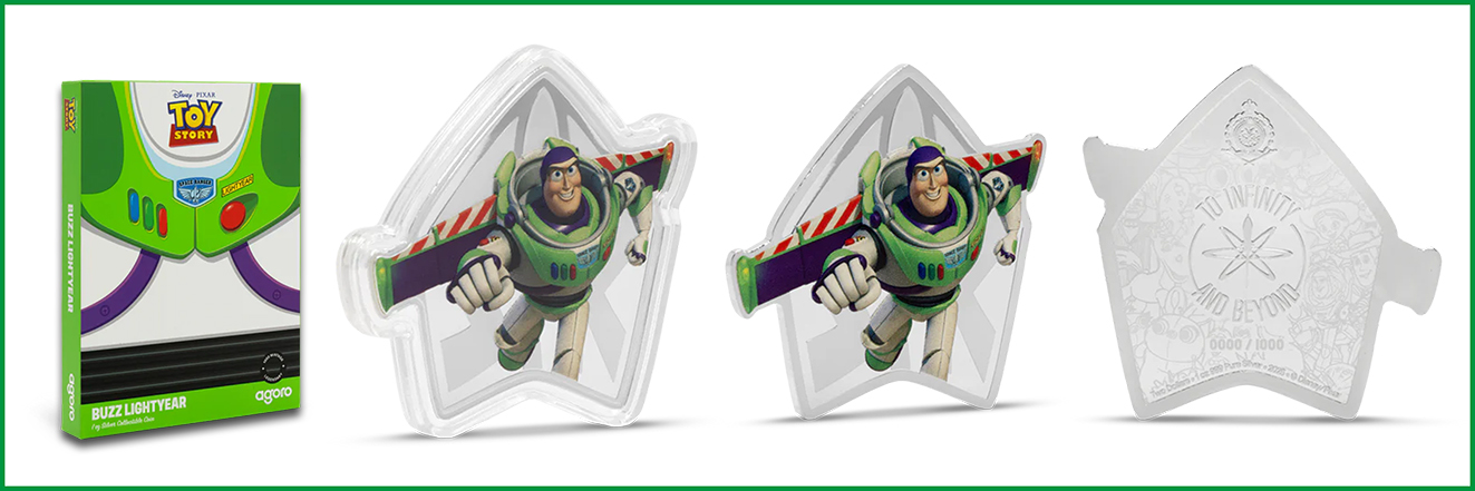 Mit von der Party als dynamisches Duo ist Woodys Kumpel Buzz Lightyear. Die Silbermünze ist in der Form seines Raumschiffs gehalten und stellt den Raumfahrer in seinem klassischen Weltraumanzug mit den charakteristischen Details dar. Die Abmessungen belaufen sich auf 50 x 49,6 Millimeter.