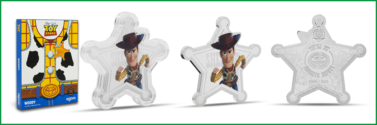 Die New Zealand Mint vertreibt über ihre Tochtergesellschaft Agroro die sogenannten »Collectible Coins«. Hierbei handelt es sich um colorierte Silbermünzen im Shaped-Design. Neu dabei sind Woody und Buzz aus dem ersten Disney-Pixar-Animationsfilm »Toy Story«, der in diesem Jahr sein 30. Jubiläum feiert. Woody ist in Form eines Sheriff-Sterns ausgeführt und zeigt auf seiner Rückseite den Spielzeughelden Woody in seinem Originaldesign von 1995. Ergänzt ist das Design durch den Schriftzug »SHERIFF«. Die Wertseite bildet das Landeswappen des Inselstaats Niue ab, der als Ausgabeland fungiert. Integriert ist der Nennwert über 2 Neuseelanddollar (NZD) und das Erscheinungsjahr 2025. Die Woody-Silbermünze zu einer Unze hat eine Größe von 50 x 47,9 Millimeter. Ihr Feingehalt beläuft sich auf 999/1000. Prägequalität ist Polierte Platte.