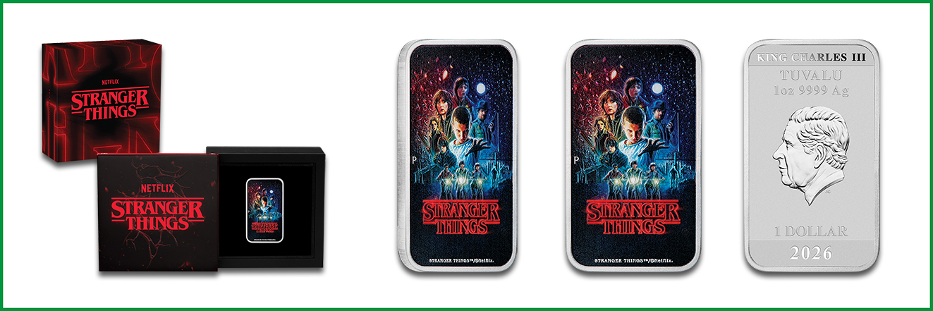 Die australische Prägestätte Perth Mint widmet der beliebten Netflix-Serie »Stranger Things« eine neue Münzreihe. Den Auftakt machen die beiden Poster-Designs der Staffeln 1 und 2. Die US-amerikanische Science-Fiction-Mystery-Serie spielt in den 1980er-Jahren im fiktiven Ort Hawkins im Bundesstaat Indiana. Im Mittelpunkt stehen vier befreundete Jungen und das Mädchen Elfi (Eleven), das über psychokinetische Fähigkeiten verfügt. Ihre Abenteuer führen sie an die Schauplätze bekannter Filmklassiker wie etwa “E.T.”, " Poltergeist" oder “Zurück in die Zukunft”.