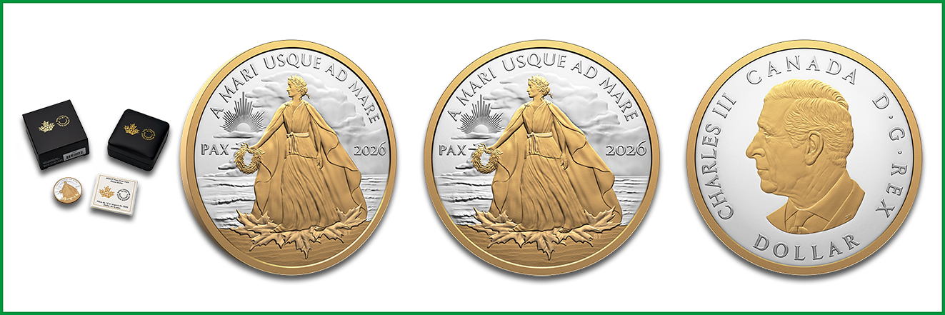 Von der Royal Canadian Mint wird eine neue Silbermünze für Sammler ausgegeben, die eine Teilvergoldung aufweist. Es handelt sich um eine Neuauflage des klassischen Peace Dollars. Dabei wird das Design der bekannten Künstlerin Susan Taylor neu interpretiert. Dargestellt ist die Lady Peace in ihrem Gewand mit Umhang und dem Siegeskranz in der Hand. Sie steht auf einem Teppich aus Ahornblättern, dem Nationalsymbol Kanadas. Im Hintergrund sind das Meer, Wolken und die aufgehende Sonne zu sehen. Die Umschrift »A MARI UNQUE AD MARE« bedeutet “Von Meer zu Meer” und bezieht sich auf den kanadischen Leitspruch, der auch auf dem Staatswappen abgebildet ist. Ergänzt ist das Erscheinungsjahr 2026. Die Vorderseite zeigt King Charles III. nach einem Entwurf von Steven Rosati. Hier ist auch der Nennwert über 1 Kanadische Dollar (CAD) integriert.