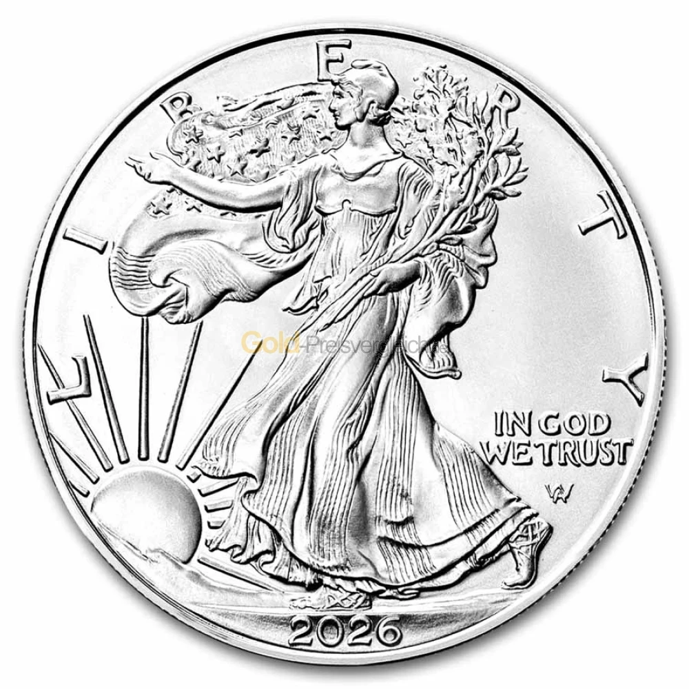 Die Silbermünze „American Silver Eagle“ zeigt auf der Vorderseite eine zum Sonnenaufgang schreitende Lady Liberty. Auf der anderen Münzseite ist ein Wappen der Vereinigten Staaten von Amerika vor einem stilisierten Weißkopfseeadler zu erkennen.